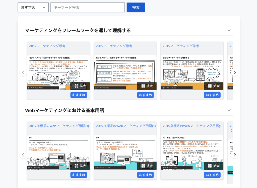 マーケティング戦略、営業プロセス設計、サイト構築、SEO、GA4解析、風評被害対策、労働生産性の向上など、ビジネス実務に直結する400本以上の専門講座を体系的に提供。